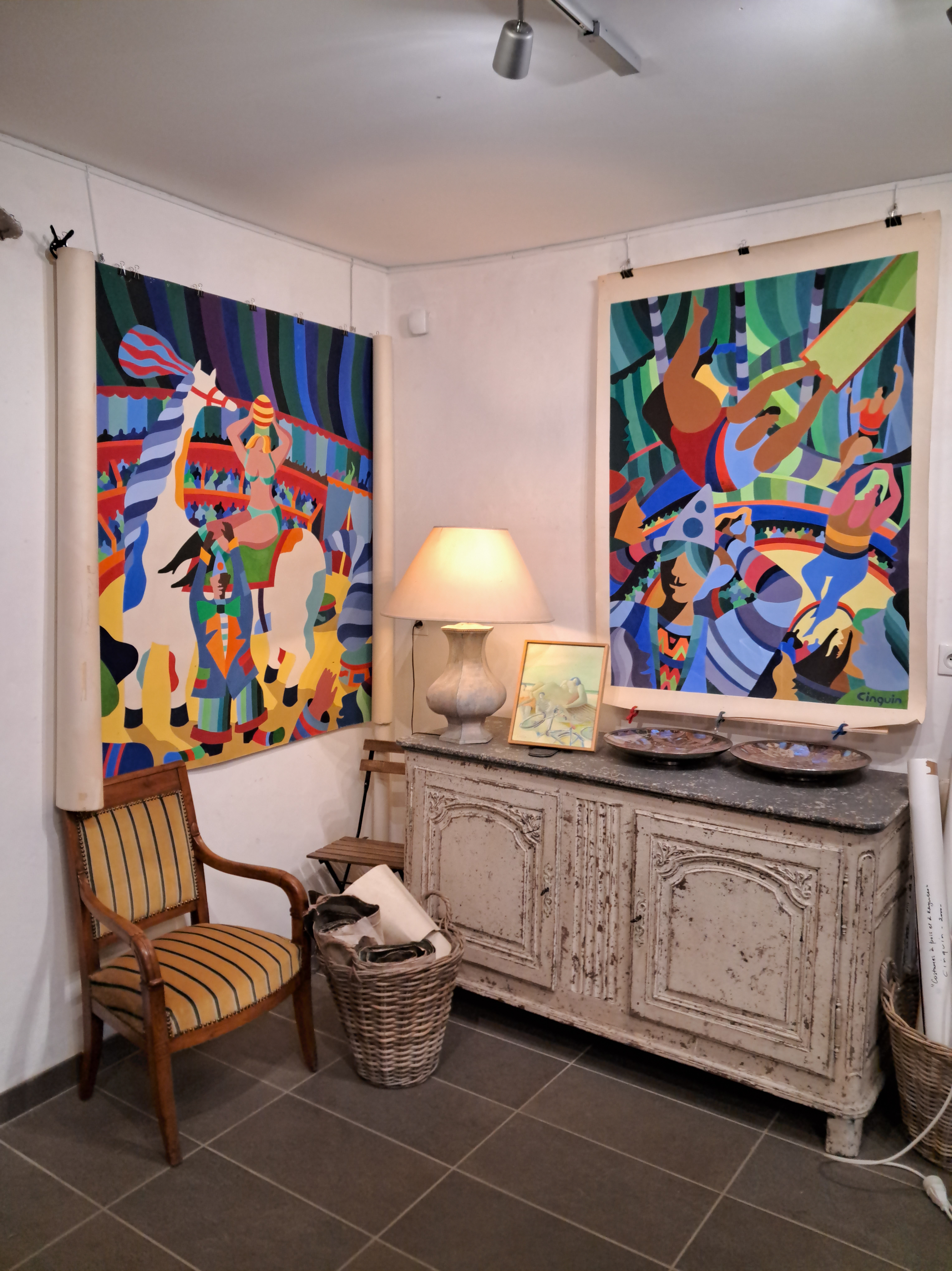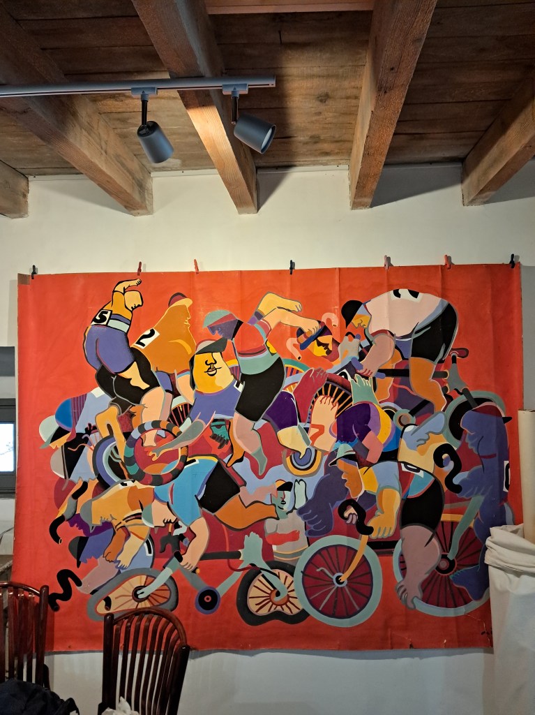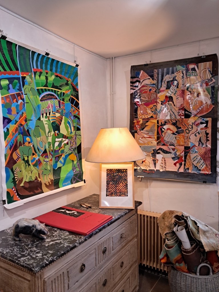 Il y a une exposition sur les cartons de Jacques Cinquin, décédé en 2019. C’était un Artiste d’Aubusson. Il était très inspiré par le monde du vélo avec des œuvres sur le Tour D’Auvergne ou le Tour de France par exemple. Mais aussi par le cirque, notamment »Le Festival International du Cirque à Monte Carlo ».
