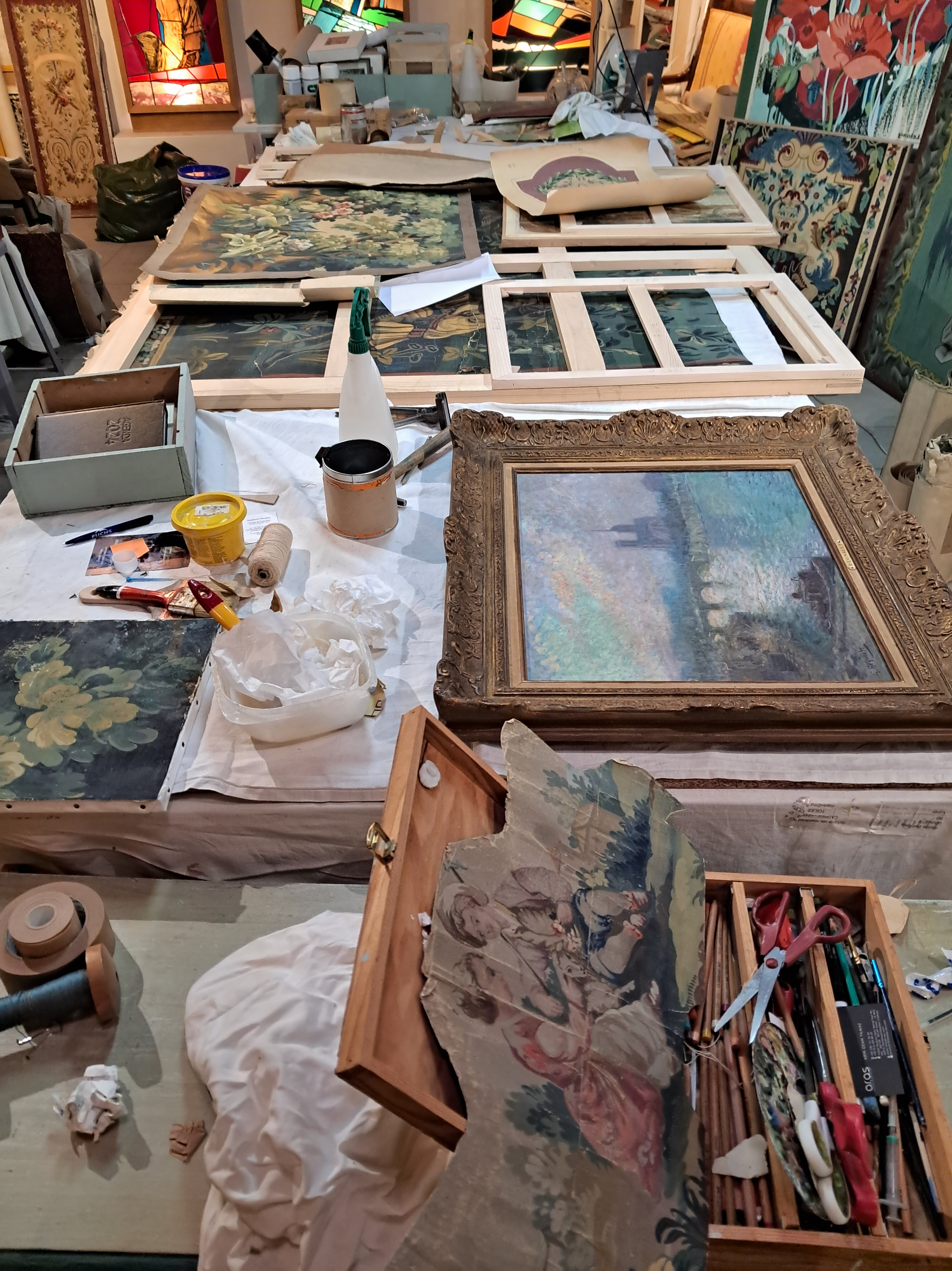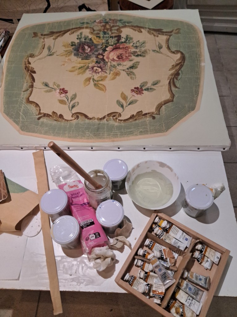 Je restaure des cartons de tapisserie huiles sur toiles ou gouaches sur papiers que je trouve roulés dans les ateliers. Ces peintures sont souvent endommagées pour les besoins du tissage (découpés, craquelés, trous d’épingles…). Je les maroufle sur toile, je les tends sur châssis, et je restaure la peinture selon la sensibilité des clients.